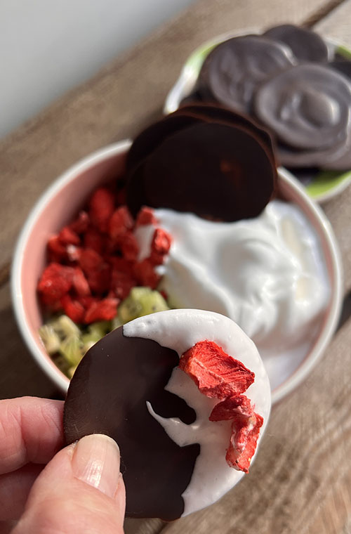 - Snij het (gevriesdroogde) fruit in kleine stukjes en serveer met de marshmallow fluff en chocolade chips.