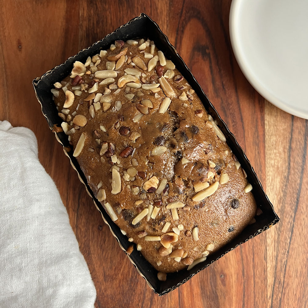 Luxe bananenbrood getopt met noten.