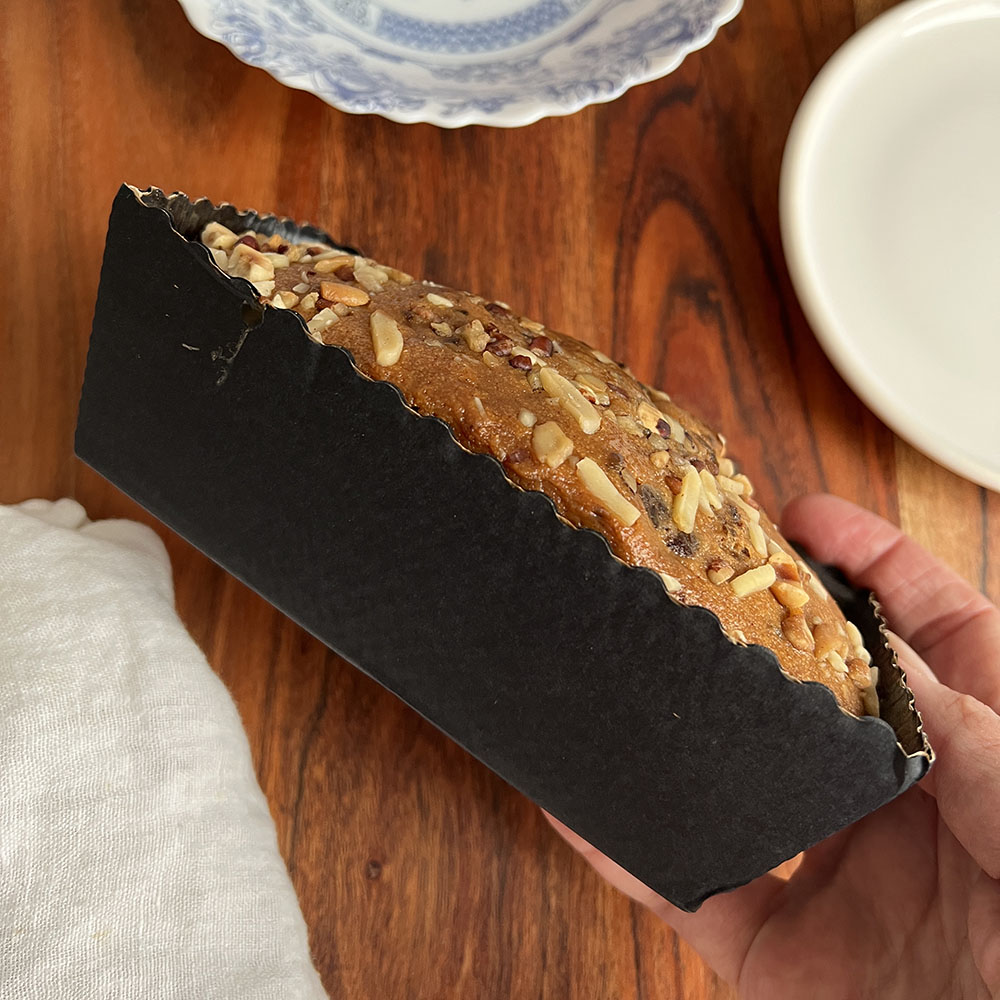 Het bananenbrood is verpakt in een kartonnen bakvorm en een plastic zak.