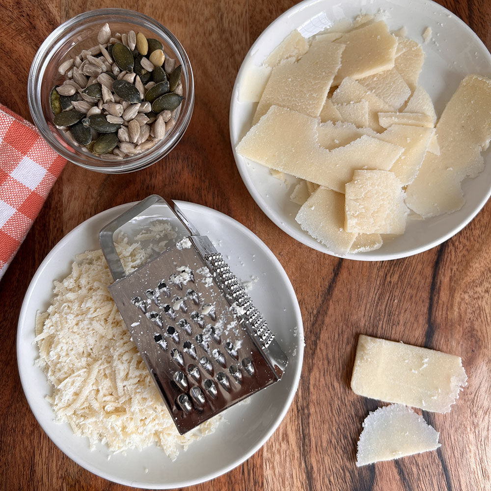 Ik gebruik voor deze salade de plantaardige Parmezaanse kaas van Vermondo verkrijgbaar bij Lidl. Deze kun je raspen of in flinterdunne plakjes snijden. Je kunt ook een ander alternatief voor kaas gebruiken die je lekker vindt. En voor wat extra crunch voeg ik ook graag wat zonnebloem- en pompoenpitten toe, maar dat is optioneel.
