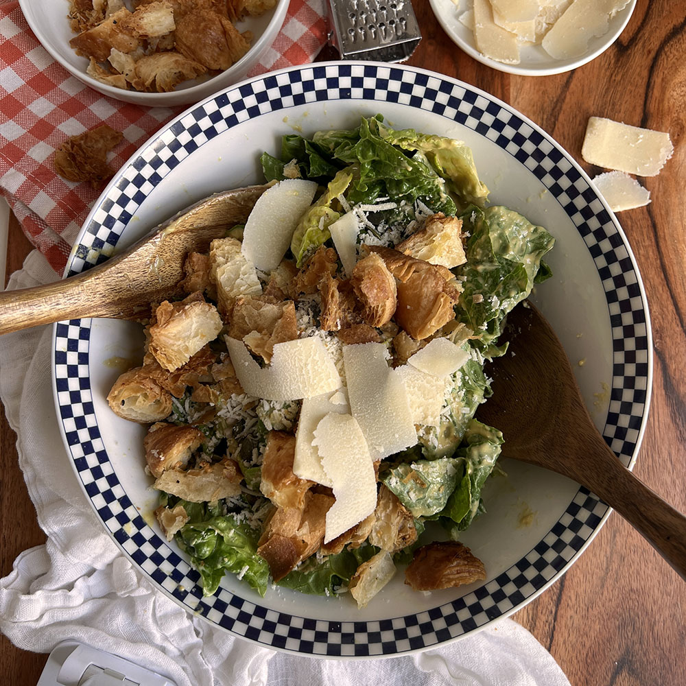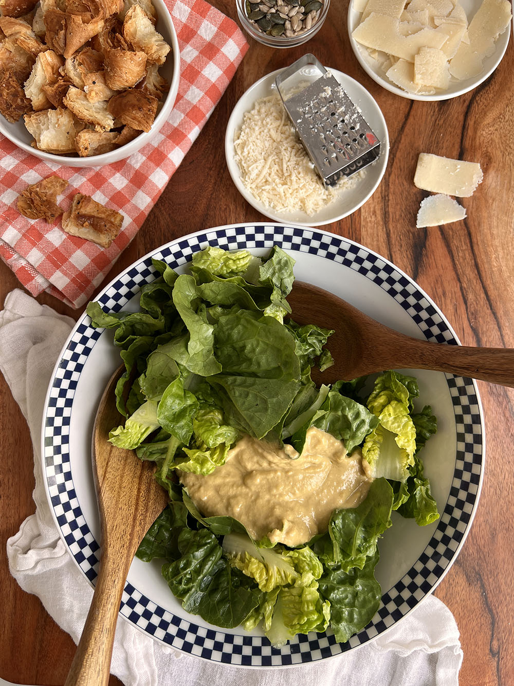 Zin in een romige, smaakvolle salade die helemaal plantaardig is? Deze vegan Caesar salade heeft alles wat je zoekt: knapperige sla, een rijke dressing met een umami-kick, en als topping mijn zelfgemaakte croitons oftewel krokante croutons van croissantdeeg. Heerlijk als lunch, lichte avondmaaltijd of bijgerecht. En geloof me: niemand mist de kaas of ansjovis. In dit recept laat ik je zien hoe je ‘m maakt. Simpel, snel en zo lekker!