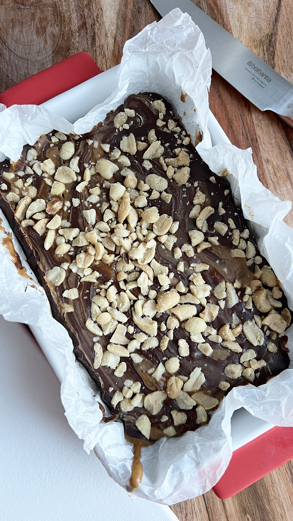 - Verdeel de grofgehakte pinda’s erover en zet een uurtje in de vriezer.