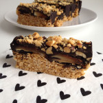 Smelt de chocolade en kokosolie in de magnetron en roer door. Giet over de pinda’s en strijk glad met een spatel. Bestrooi met de fijngehakte pinda’s en wat zeezout naar smaak. Zet een uur in de vriezer of tot de chocolade hard geworden is. Verwijder uit het bakblik en snij in repen. Bewaar in een vershouddoos in de vriezer