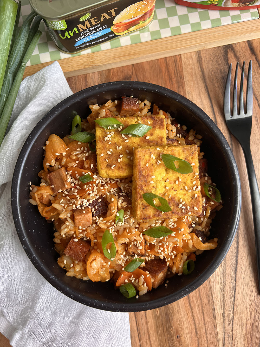 - Verdeel de gebakken kimchi rijst over twee borden, garneer met de tofu omeletjes, sesamzaadjes en ringetjes lente-ui.