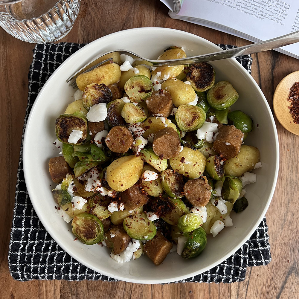 Geen fan van spruitjes? Waarschijnlijk heb je alleen de papperige, kapot gekookte variant geproefd. Maar wist je dat een andere bereiding de smaak totaal kan veranderen? Rooster of wok ze eens, en ontdek hoe heerlijk spruitjes eigenlijk zijn! Ik combineerde ze met gebakken gnocchi, worst en feta – uiteraard allemaal plantaardig. Een heerlijke maaltijd die in weinig tijd op tafel staat!