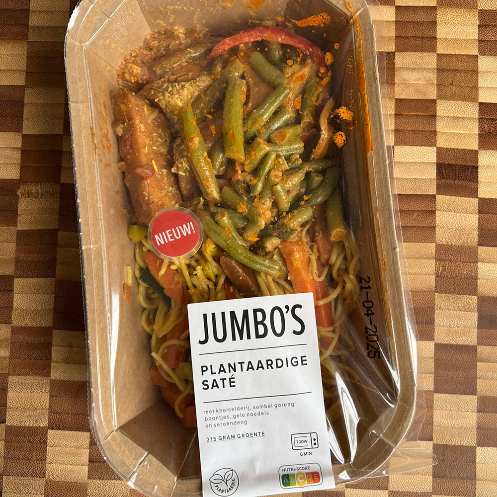 De Jumbo maaltijd met plantaardige saté weegt 450 gram waarvan 215 gram groente, kost € 5,99 (t/m 22 april in de aanbieding voor € 4,49) en is verkrijgbaar bij Jumbo.