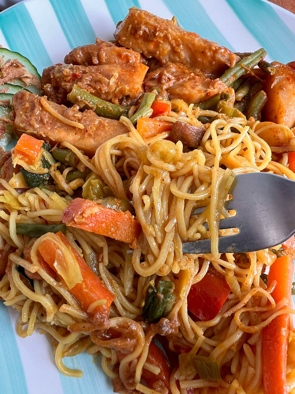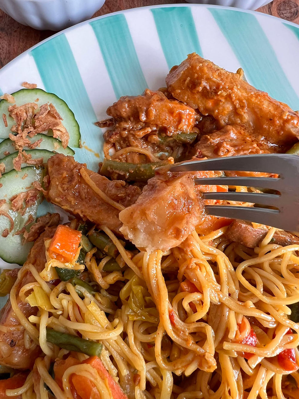 De kokossmaak is aanwezig, maar gelukkig niet overheersend. De gele noodles zijn lekkeren de groenten zijn goed gaar. Het meest verrassend aan deze maaltijd vind ik de saté van knolselderij: die is zo sappig! En de satésaus erover, echt heel erg lekker. Ik deed er zelf nog wat komkommer en gebakken uitjes bij en dat raad ik je aan, de combinatie van saté met komkommer en gebakken uitjes is gewoon geweldig toch? Voor de frisheid en de extra bite.