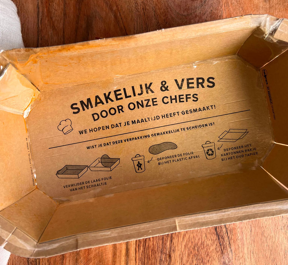 De maaltijd is verpakt in een kartonnen schaal die gecoat is met een laagje plastic. Op de bovenkant is de maaltijd goed zichtbaar door de plastic folie en de sticker voorop laat duidelijk zien wat er in zit.