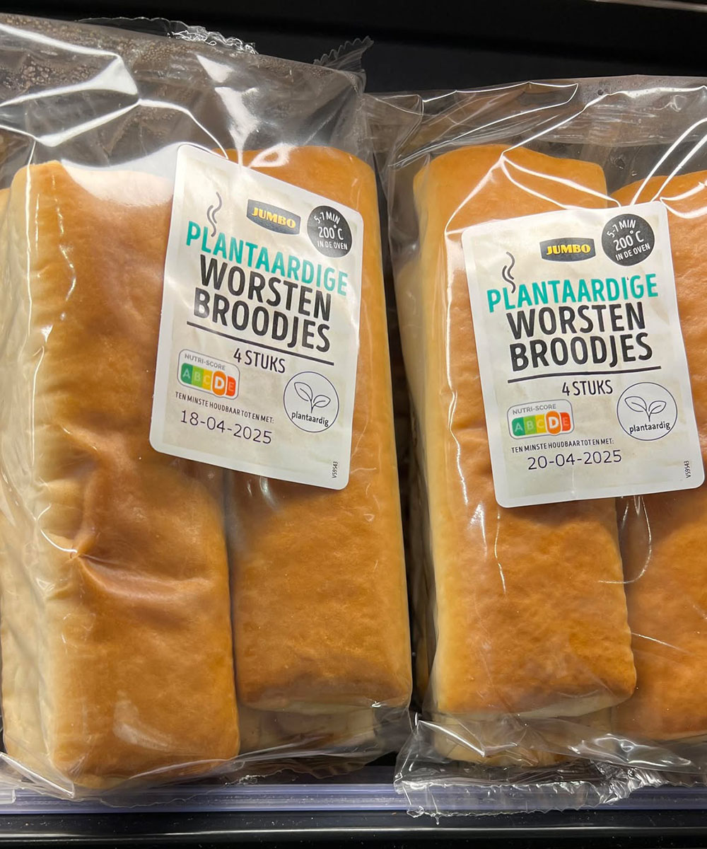 - plantaardig worstenbroodje 80 gram en € 0,99 per stuk