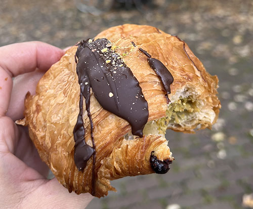 Nog iets waar ik echt heel erg gelukkig van kan worden: een wandeling naar en over de Rotterdamse Oogstmarkt. Het hele jaar door iedere zaterdag op het Noordplein vol kramen met heel veel vegan opties. Maar het allerfijnst is deze markt in deze tijd van het jaar. De sfeer, de knusheid, de herfstbladeren, de kleuren: echt, het is er zo fijn! Ik probeer steeds weer at nieuws te ontdekken bij de verschillende kramen. Maar eentje waar ik maar moeilijk voorbij kan lopen is die van Epicurieus. Je kunt hier terecht voor de lekkerste koeken, taartjes en broodjes. En zo fijn, alles is vegan. Van kokosmakroon tot mergpijp! Dit keer liet ik me verrassen door de Dubai croissant, geïnspireerd door de bekende viral chocoladereep waarvan ik trouwens een heerlijke vegan versie maakte. Ik had niet anders verwacht: wat een zalige croissant. Heerlijk zoet maar niet te met een goeie pistache smaak en chocolade en de croissant heeft een lekkere knapperige korst!