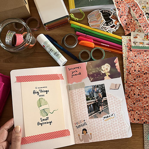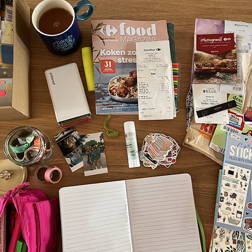 Denk hierbij aan kassabonnetjes, snoeppapiertjes, een papieren servetje, een stukje van een vervoersbewijs, noem maar op. Of, eenmaal als actieve junk journaller ga je er naar op zoek. Dan vraag je juist om een extra papieren servetje of raap je dat kleurrijke herfstblad van de grond om later netjes in je dagboek te plakken. Want dat is wat je vervolgens doet: je maakt een soort collage van alles wat je die dag bij elkaar hebt gesprokkeld. Plak het op de pagina’s in je blanco notitieboek en schrijf er wat herinneringen bij. Of wat voor tekst je maar wil. Je wordt creatiever en beleeft de dag intenser, ik wel merk ik.