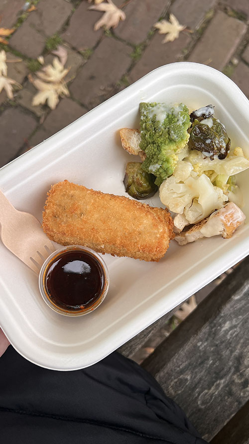 Ook ging ik naar de stand van Nori Catering. Eigenlijk dacht ik het al te weten maar checkte toch voor de zekerheid toen ik iets aanwees en vroeg aan de vrouw achter de kraam: “is this vegan?” Dat zijn de mooie momenten, heb ik al een paar keer meegemaakt in mijn veganist zijn jaren: die blik in de ogen van de persoon aan wie je dat vraagt. Een soort (terechte) trotse twinkeling. “Everything is vegan”. Kijk, now we’re talking. Ik bestelde een katsu tofu die ik al eens eerder had met deze keer de bloemkoolsalade erbij. Ik nam het to go, om het een stukje verderop op een bankje rustig op te eten. Deze maaltijd geef ik serieus een 10. Het koste € 8 en dat was iedere cent waard. Je proeft de liefde die in dit eten zit. Perfect bereid en zo goed op smaak. Ik zou dit zonder overdrijven iedere dag kunnen eten.