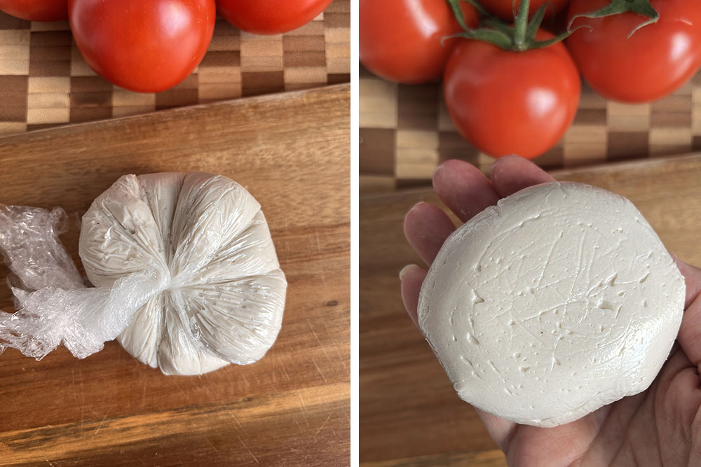 - Haal de folie eraf en je plantaardige mozzarella is klaar om te gebruiken.
