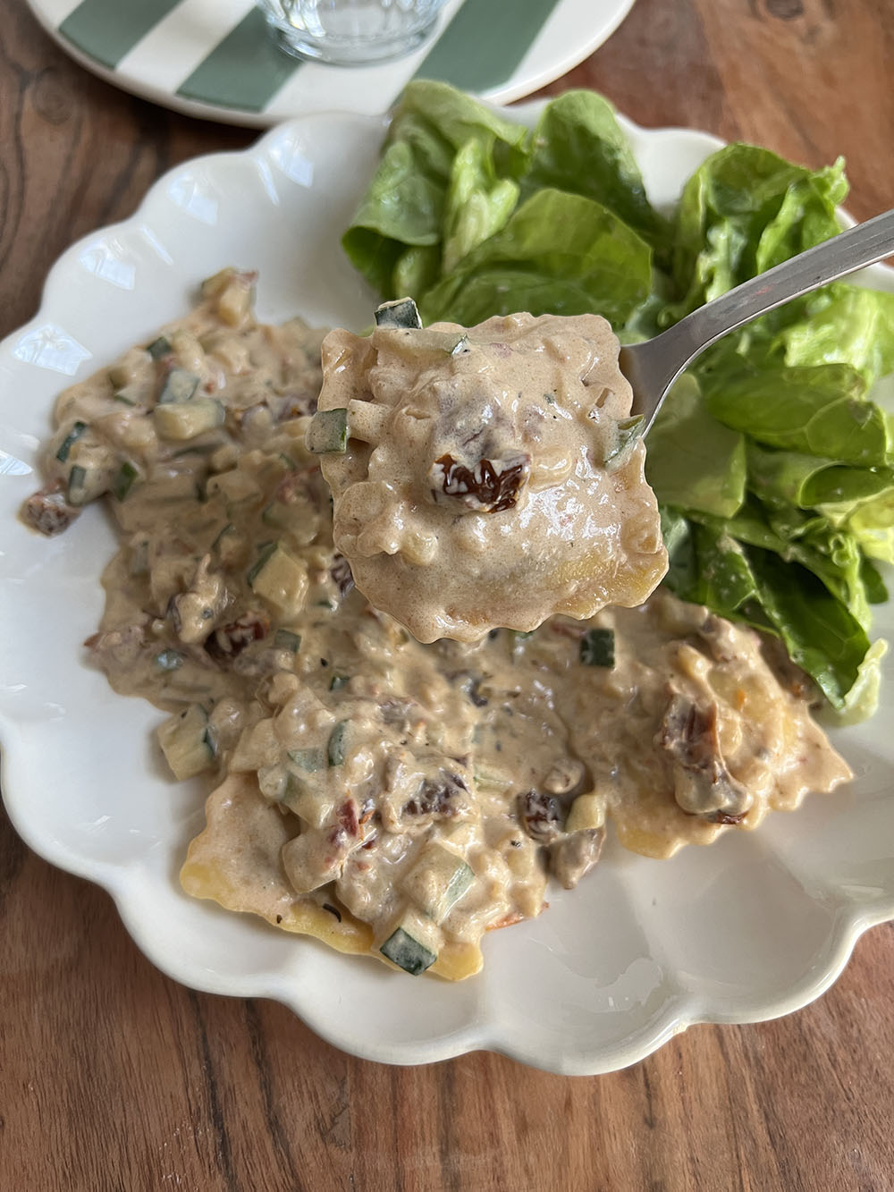 Ravioli in romige saus met courgette en zongedroogde tomaat