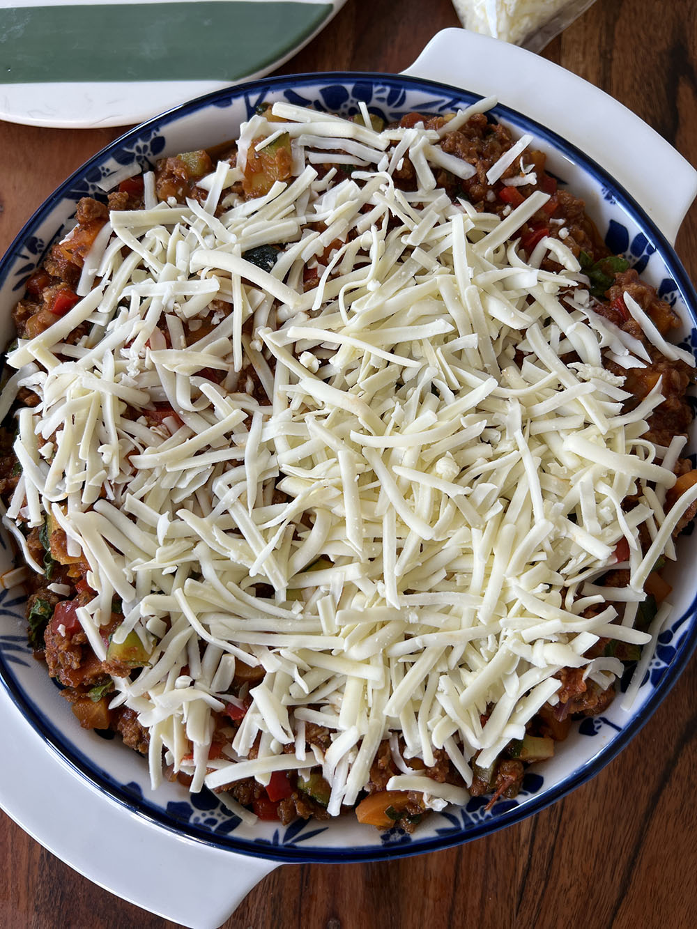 - Zet de ovenschotel 10-15 minuten in de oven tot de plantaardige geraspte kaas gesmolten is.