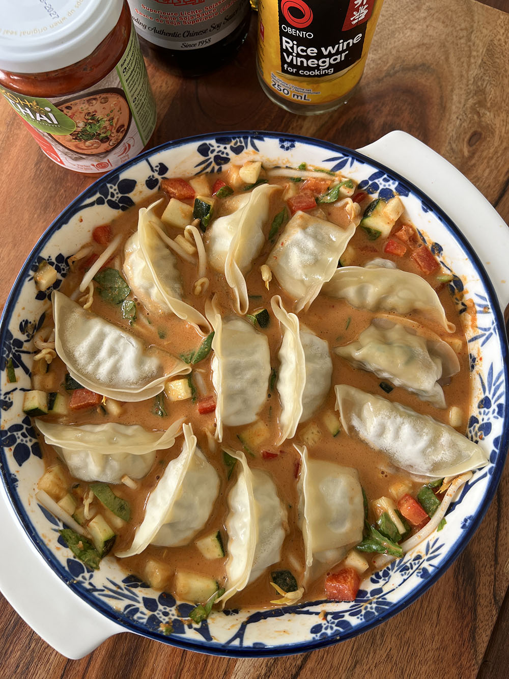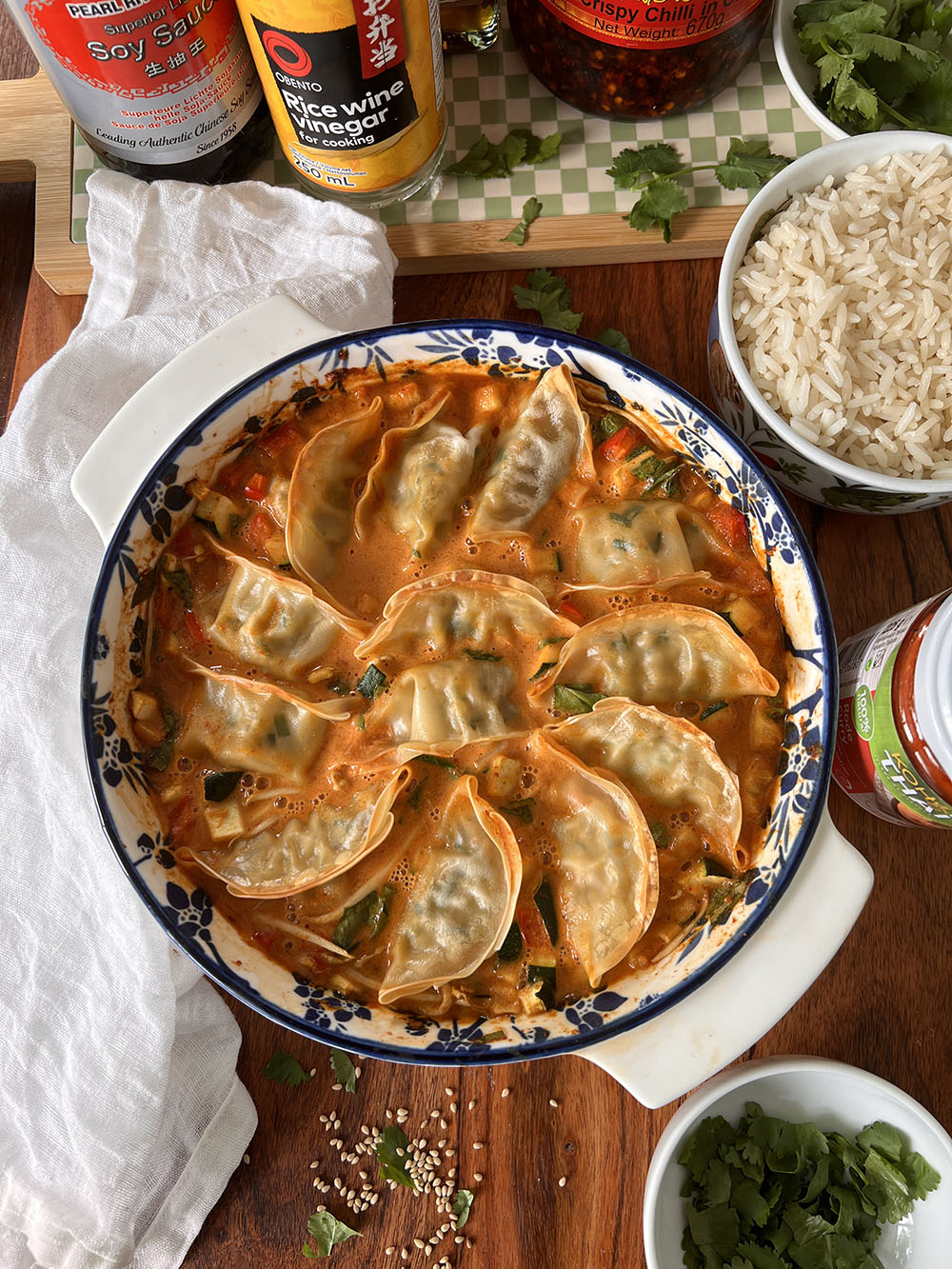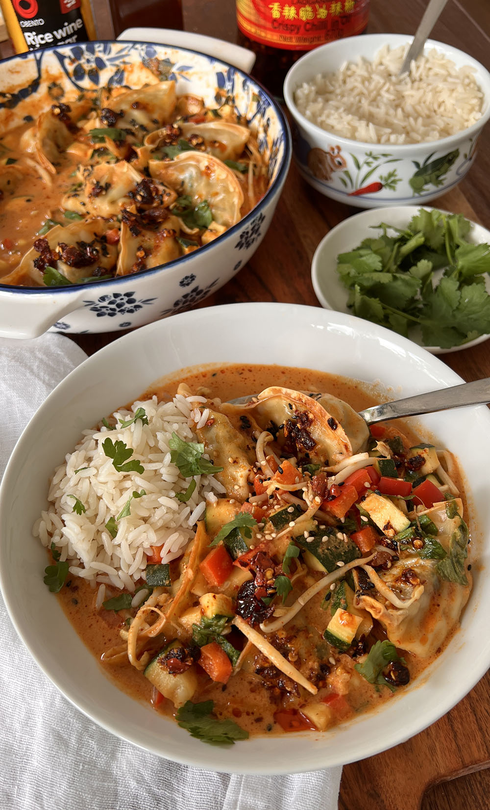 De populariteit van dit gerecht is heel begrijpelijk: een romige saus waarin allerlei groenten en dumplings gaar gestoofd worden in de oven. Wat toppings zoals koriander en sesamzaadjes erover en klaar! Ik at er rijst bij, die heerlijk combineert met de saus.