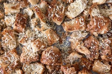 Zin in een romige, smaakvolle salade die helemaal plantaardig is? Deze vegan Caesar salade heeft alles wat je zoekt: knapperige sla, een rijke dressing met een umami-kick, en als topping mijn zelfgemaakte croitons oftewel krokante croutons van croissantdeeg. Heerlijk als lunch, lichte avondmaaltijd of bijgerecht. En geloof me: niemand mist de kaas of ansjovis. In dit recept laat ik je zien hoe je ‘m maakt. Simpel, snel en zo lekker!