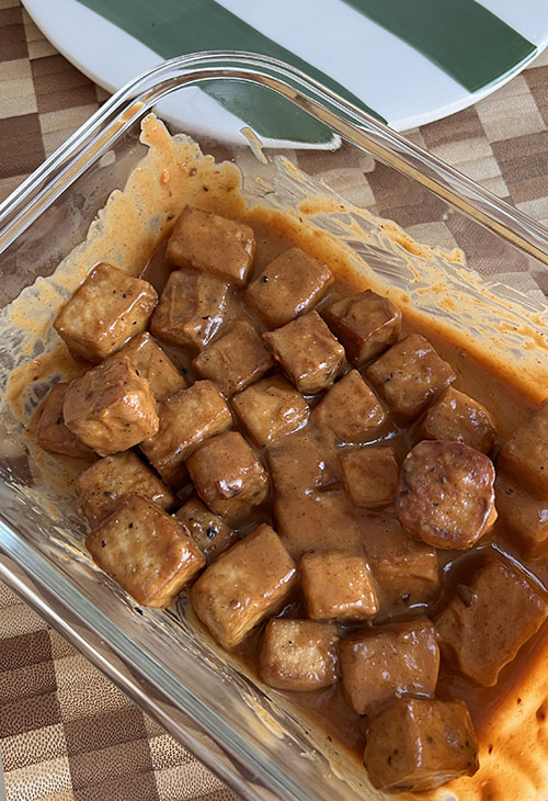 - Meng de blokjes tofu met de pindasaus.