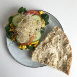 Snij het Turks brood doormidden en smeer er een laagje hummus op. Beleg met de babyspinazie, komkommer, tomaat, alfalfa en de tofu.