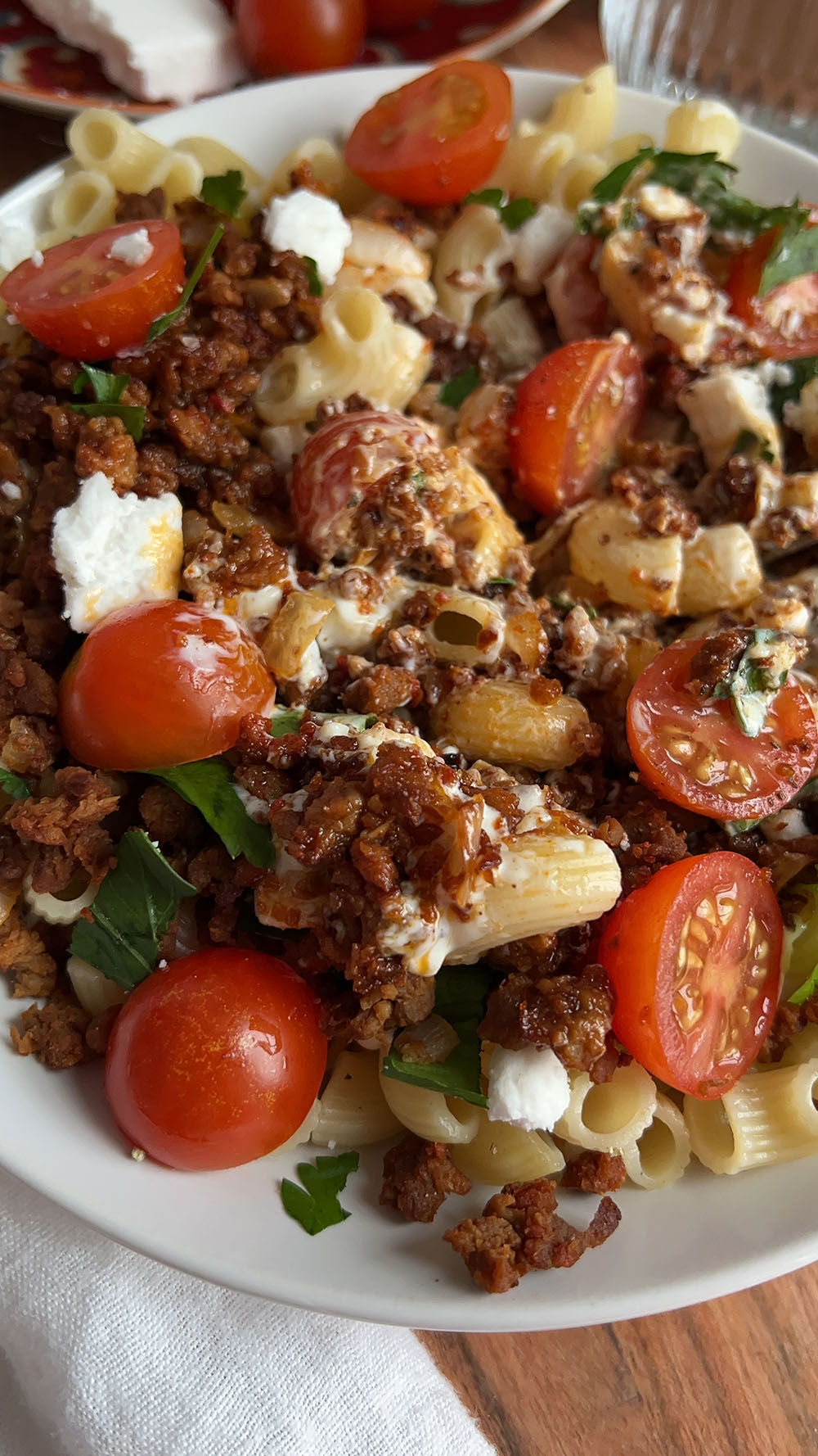 Het water liep me in de mond toen ik de ene na de andere video voorbij zag komen van dit gerecht dat momenteel viral gaat: Turkse pasta van de Australische influencer Anna Paul. Ik maakte een heerlijke plantaardige versie!