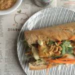Snij het stokbrood in twee stukken. Snij het dan doormidden aan de bovenkant en vul met ijsbergsla, de ingelegde (en afgegoten) groenten, taugé, tofu, koriander, lenteui, pindasaus en bestrooi met de grofgehakte pinda’s.