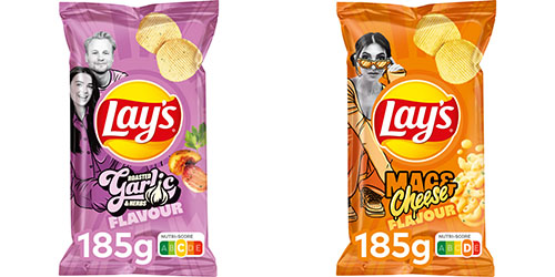 Bij Albert Heijn zijn er van Lay’s twee nieuwe vegan smaken verkrijgbaar in de varianten roasted garlic en mac & cheese.