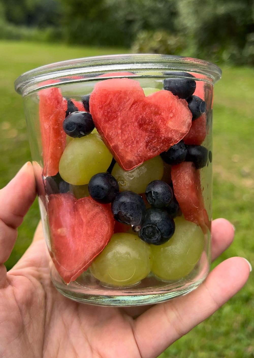 Meng fruit naar keuze en doe deze in een pot. Ik heb deze keer gekozen voor watermeloen, aardbeien, blauwe bessen en bevroren witte druiven. Die laatste is extra lekker op een heel hete dag!