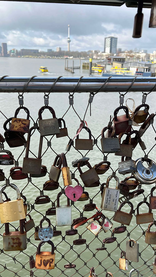 Daarna wandelden we naar de Rijnhavenbrug, deze wordt vanwege de vorm ook wel de taartschep genoemd. Een mooie wandeling door de stad en op deze plek krijg ik altijd een beetje het gevoel alsof ik door New York loop vanwege de enorme gebouwen. De relingen van deze brug zijn volgehangen met hangslotjes waarop geliefden hun namen zetten. Precies wat Fabien en ik deden in 2017 zoals ik hier schreef. Fabien had verwacht dat het slotje er niet meer zou hangen, ik dacht van wel en had gelijk: hij hangt er nog! Ook onze initalen zijn nog zichtbaar. Zo leuk! Hieronder zie je ons slotje, het is het rode hartje in het midden van de foto.