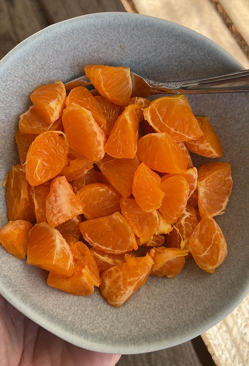 Toen ik aan het einde van de middag weer thuis kwam at ik twee mandarijntjes. En ik vind deze zo fijn: in plaats van een mandarijn pellen snij je ‘m doormidden en zo wip je de (halve) partjes er zo uit.