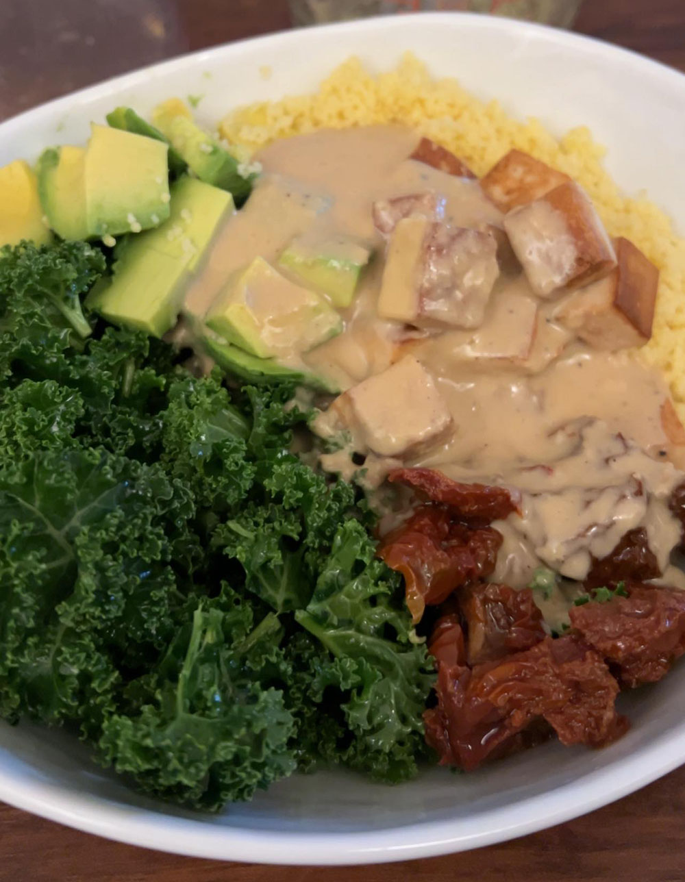 ’s Avonds maakte ik deze lekkere salade met verse boerenkool, couscous, zongedroogde tomaat, gerookte tofu avocado en een dressing met tahin.