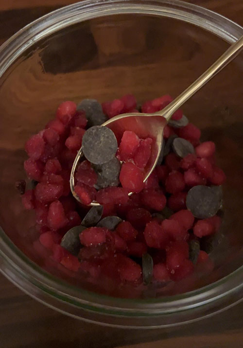 Dit is momenteel een foodtrend waar ik me helemaal in kan vinden: granaatappelpitjes met chocolate chips. Dit was een lekker toetje!