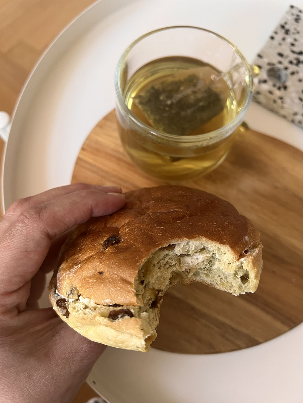 Krentenbol met een kop thee