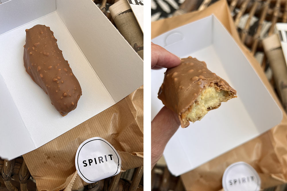 Ooh, een vegan eclair! Ik kocht ‘m bij Spirit op deze zondagochtend tijdens mijn wandeling. Ik had op social media er al over gelezen en daar lagen ze: twee soorten vegan eclairs waaronder deze met chocolade en hazelnoten en die ging natuurlijk mee naar huis. Heel erg lekker, ik had ook niet anders verwacht want bij Spirit maken ze zulke zalige dingen!