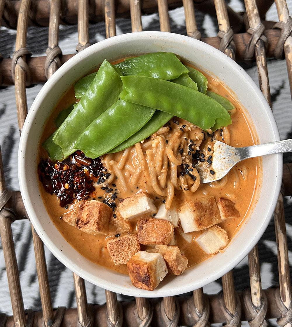 Heerlijk noodles in een romige pinda-curry saus met blokjes krokante tofu en peultjes. Kijk hier voor het recept, dat opent in Instagram.