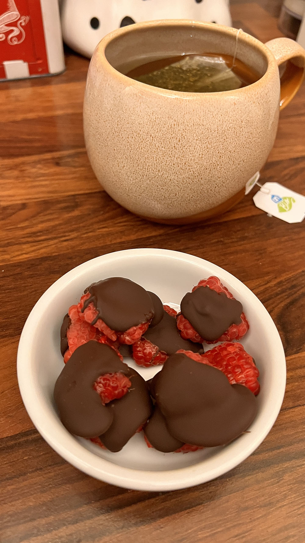De frambozen waren in de aanbieding, dus trakteerde ik mezelf op deze zalige snack: druk frambozen plat, of nou ja eigenlijk hoeft dit niet per se maar ik vind het een lekkere bite zo. Doe er wat gesmolten pure chocolade over, zet ik de koelkast tot de chocolade weer hard is en geniet. Dit is zo eenvoudig maar zo zalig!
