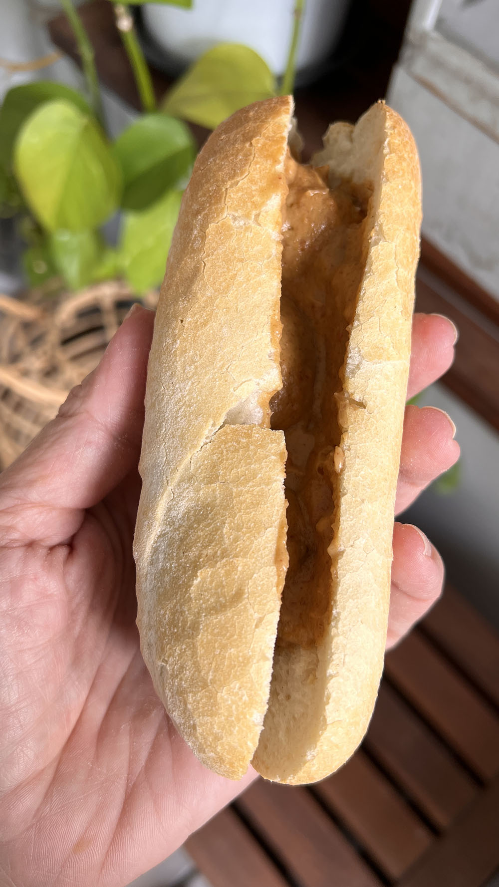 Ik bakte wat plantaardige gehaktballetjes van AH Terra, deed deze in wat pindasaus en dat vervolgens op een pistoletje. Superlekker! De pindasaus maak ik zo: 100% pindakaas en sambal oelek mengen met wat plantaardige melk, sojasaus en een scheut water tot je de gewenste dikte hebt en dan verwarmen.