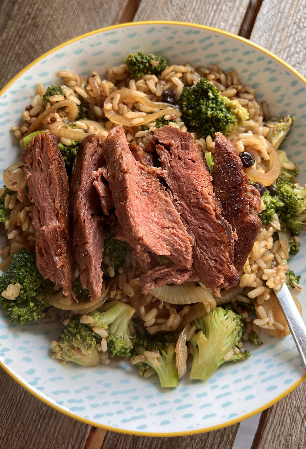 Een klassieker: rijst met broccoli, ui en plantaardige steak. Soms maak ik zelf een woksausje en nu gebruikte ik zwarte bonen saus, erg lekker!