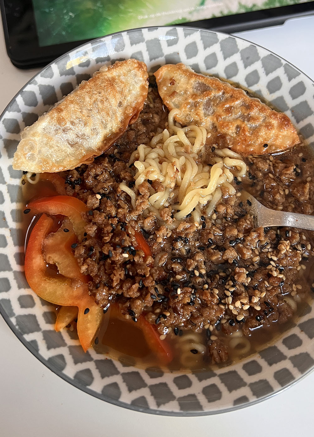 Noodlesoep geserveerd met vegan gehakt, puntpaprika, sesamzaadjes en vegan gyoza. Deze keer koos ik die van bibigo, die kun je onder andere kopen bij Albert Heijn en Amazing Oriental en je vindt ze in het vriesschap!