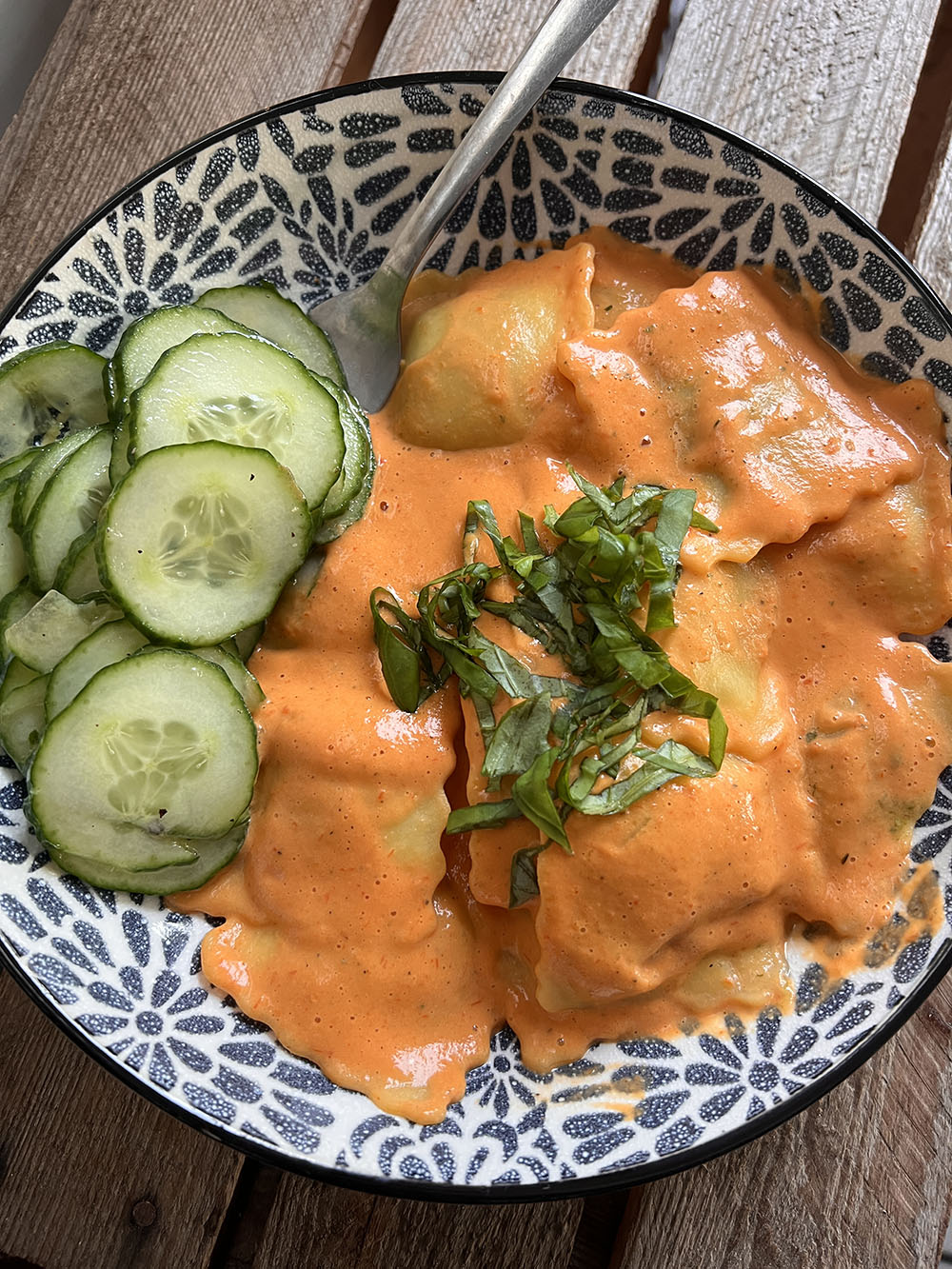 Ooh, dit was zo lekker. Ik maakte een zelfgemaakte saus met geroosterde paprika, knoflook, allerlei kruiden, groentebouillon en kookroom en serveerde deze met vegan ravioli van AH. Wat verse basilicum erover en wat komkommer erbij. Voor herhaling vatbaar! Ik zal het recept binnenkort delen.