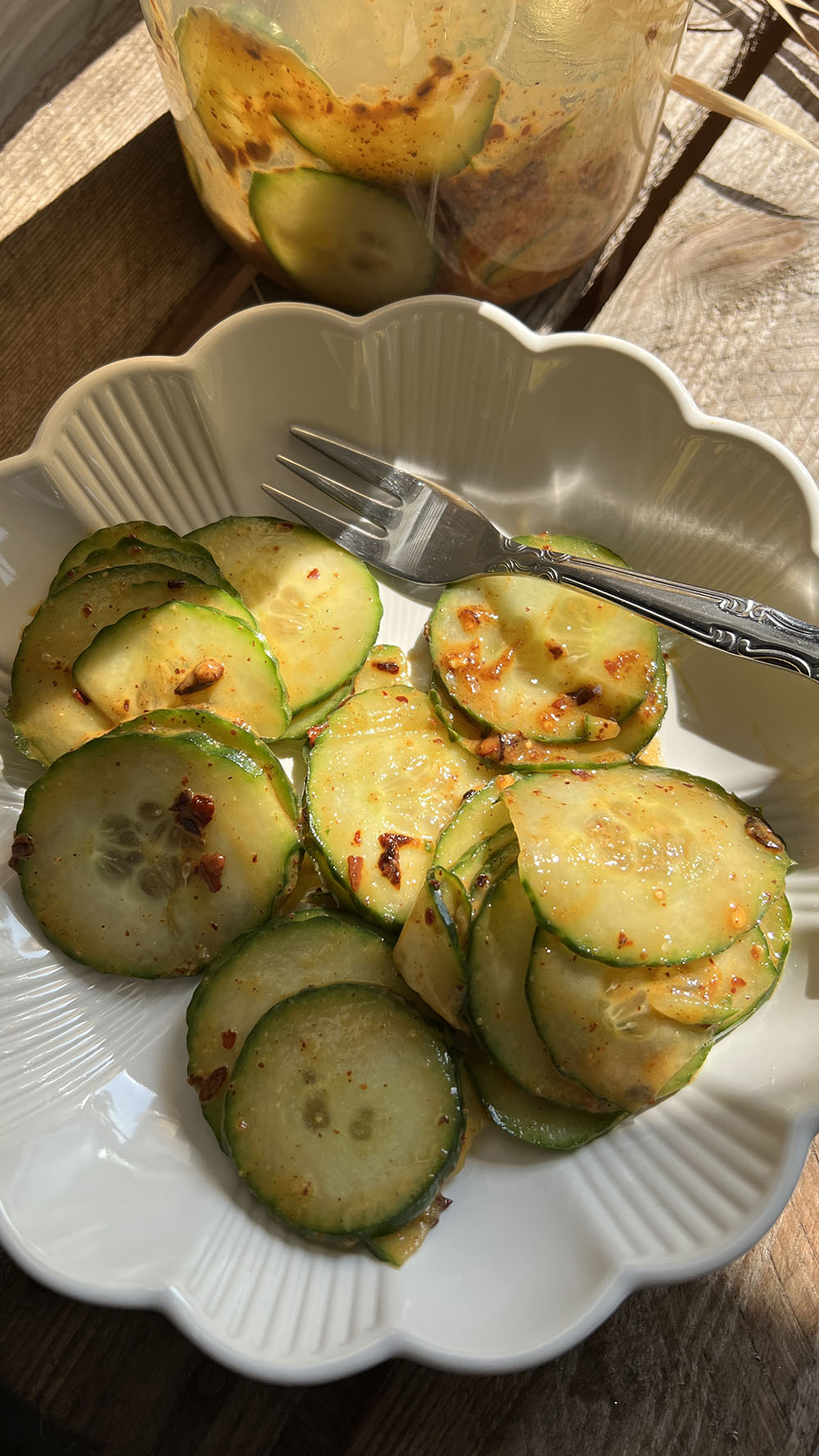 Komkommerplakjes gesneden met een mandaline (gebruik! het! opzet! stukje!) met onder andere 100% pindakaas, sojasaus en crispy chili olie. Kijk hier voor het recept.