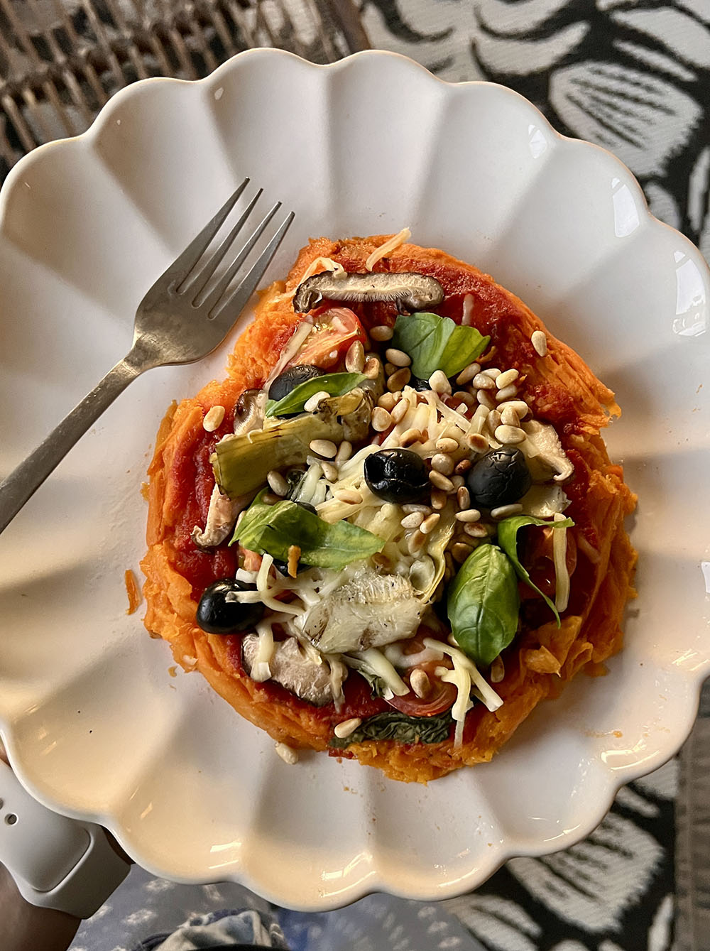 Dit zag ik voorbij komen op TikTok, het is eigenlijk geen pizza te noemen maar wel heel lekker en gezond. Snij een zoete aardappel in twee helften, prik er gaatjes in en bestrijk met olijfolie. Leg met de snijkant op bakpapier en bak in de voorverwarmde oven op 180 graden oven tot de zoete aardappel zacht is en je er makkelijk met een vork in kunt prikken, dit duurt ongeveer 30 tot 40 minuten afhankelijk van hoe groot de zoete aardappel is. Leg dan een helft op een met bakpapier beklede bakplaat en knijp zodat de schil eraf gaat, of trek deze eraf als dat makkelijker gaat. Leg een stukje bakpapier op de zoete aardappel en druk plat met bijvoorbeeld een bord. Vorm met een lepel of vork in een ronde vorm. Verdeel er pizzasaus en toppings naar keuze en vegan geraspte kaas over. Bak in de oven tot de kaas is gesmolten en serveer.