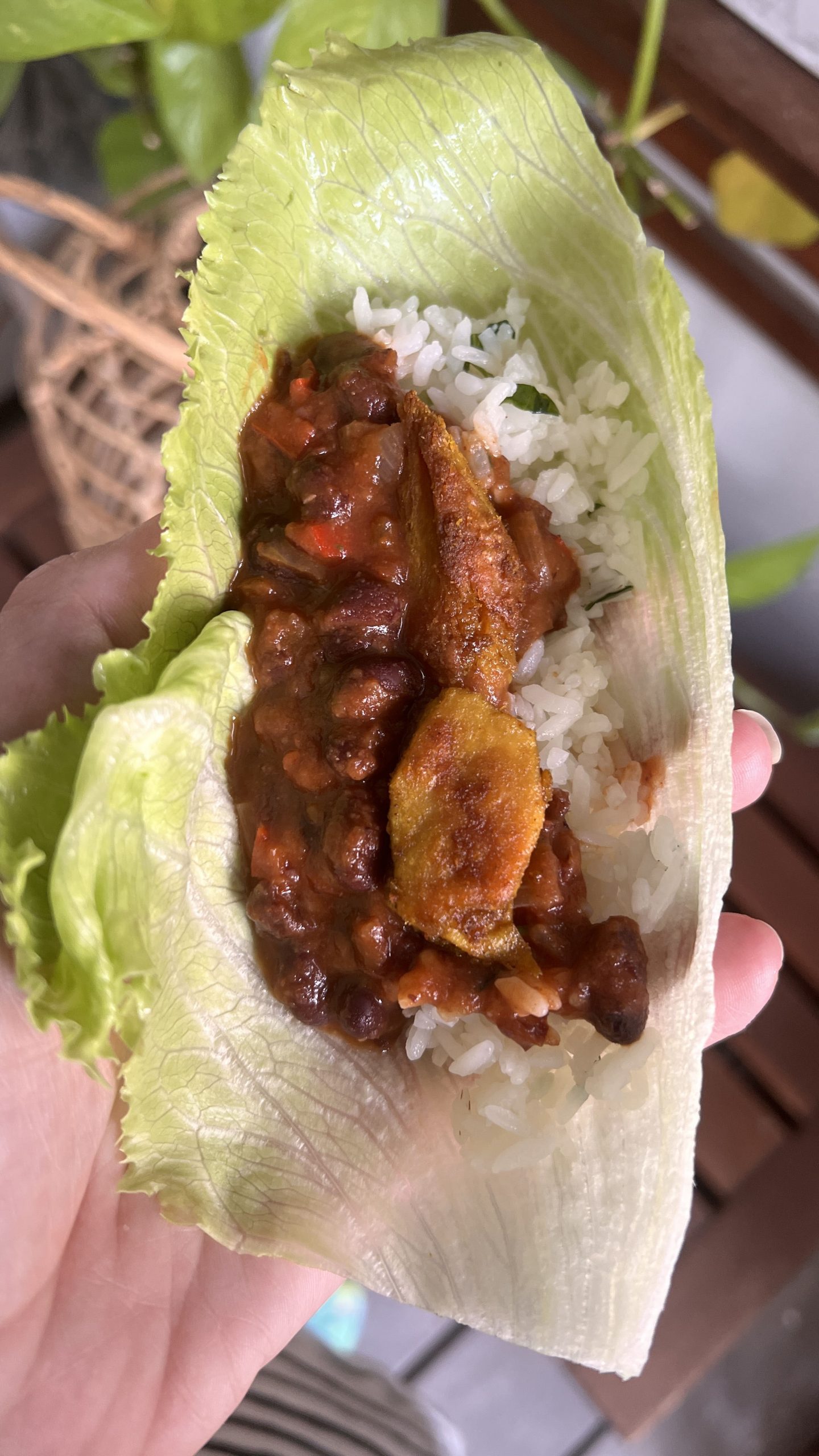 Een paar dagen erna at ik het met gebakken vegan kipstukjes in bladeren ijsbergsla als ’taco’, ook hartstikke lekker.