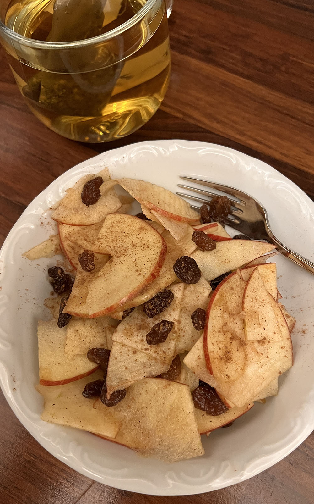Flinterdunne halve plakjes appel, rozijnen en wat kaneel. Supersimpel maar zo lekker!
